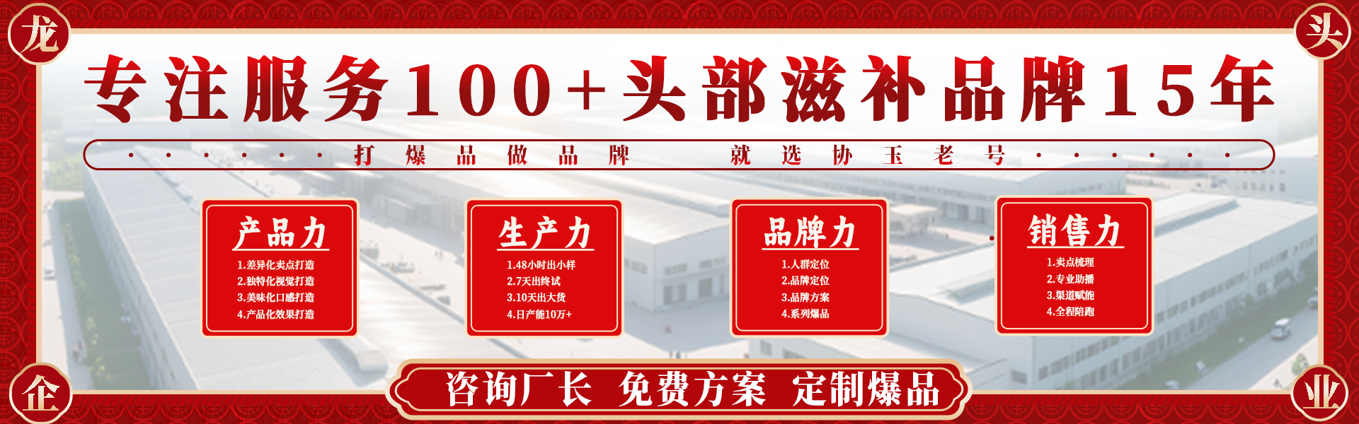 协玉老号成立于2009年,始终专注于打造全球 领先的中式滋补、保健茶饮原料全产业链一体化服务,我们聚焦产品原产地、链路可溯源、生产标准化、管理数字化,从而解决行业原料粗放,品质不稳定的痛点。从原料种植、采集到成品销售的每一个环节,为客户提供高品质、 可信赖的滋补产品、茶叶产品和配套产品服务。公司拥有员工400余名,产业覆盖全球,拥有广东新会和山东东阿两大现代化生产基地,总占地面积达50000平方米,配备800平方米高标准实验室及15000平方米10万级GMP净化车间,构建了从原料甄选、生产加工到成品出库的全链条产业体系。凭借强劲的产能实力与优质的产品品质,产品远销全球70个国家及地区,国内深度服务中国免税集团、京东京造等世界500强及超级头部品牌,是多个知名品牌的唯一指定合作工厂,累计服务终端客户超千万级,代工产品复购率连续多年位居行业前列。协玉老号坚持全产业链一体化经营战略和精益化管理,充分发挥原料源头优势,实现产品溯源透明化。公司在全球各地拥有自有基地,涵盖生态种植、养殖、采收、生产研发、加工与服务等环节,产品畅销海内外,是国内外知名药品和保健品企业的战略合作伙伴。规模(优化呈现):公司两大生产基地年产能稳定在5000万件,日产量可达20万件,具备百万级高标准仓储体量,配备温湿监控、新风换气等专业存储设备。在全国华东、华南、华北等消费核心区域构建了完善的服务网络,,年服务品牌方...